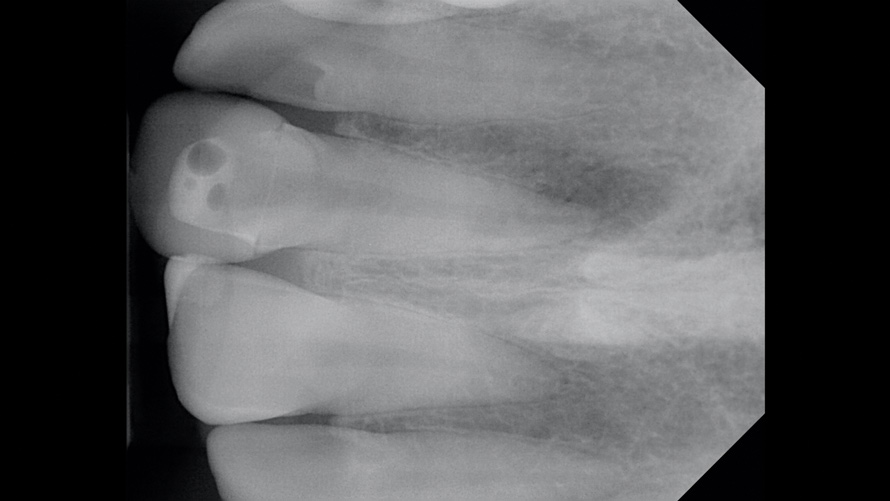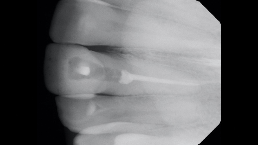 For the internal bleaching phase of patient treatment, a 35% sodium perborate solid was mixed with a 35% hydrogen peroxide liquid solution to create a thick paste and loaded into an amalgam carrier. This paste was then placed into the pulp chamber and gently packed with an endodontic plugger so as not to express the hydrogen peroxide out of the paste. An additional 2 mm to 3 mm of coronal access was left unfilled to permit the placement of a final layer of interim restorative material to seal the bleaching agents off from the extraoral environment. Polytetrafluoroethylene tape and temporary cement were then used to seal the access cavity. A final radiograph was acquired (Figure 7 and Figure 8), the provisional restoration was recemented, and each patient was then dismissed without issue.