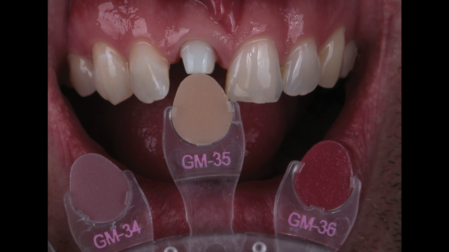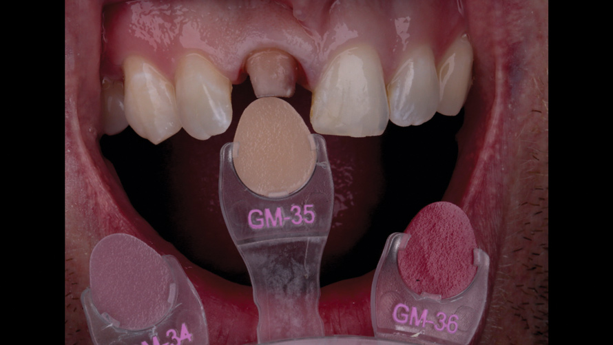 After 1 week, each patient returned for a progress evaluation of the internal bleaching treatment. Intraoral photographs of the stump shade were taken and sent to the ceramist for consultation (Figure 9 through Figure 12). In each case, it was determined that the value of the underlying tooth structure was now adequate and that no additional internal bleaching would be required. All of the zinc oxide/calcium sulfate and bleaching material were then removed, and the root canal sealer and gutta-percha were placed to seal off the canal.