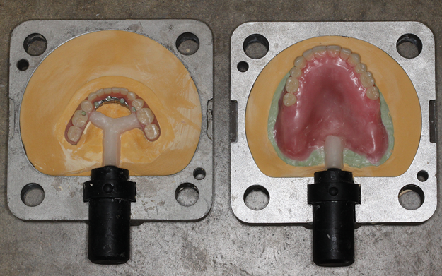 After a clinician has completed the impression procedure and tried in the prosthesis to confirm esthetics and tooth position, the laboratory completes the processing of the prosthesis. Prior to processing techniques, a technician creates a denture tooth assessment (also known as a wax-up), whereby denture teeth are suspended in pink baseplate wax onto mounted dental casts (Figure 2). The clinician has the patient return and places the proposed assessment onto the edentulous ridge to confirm the proper tooth, esthetic, and occlusal relationships, with the patient providing feedback. After confirming the aforementioned, the technician can begin processing procedures, which typically involve incorporating/flasking the denture tooth setup into a mold, followed by heating/boiling the mold until it reaches the melting point of the wax, when it is separated and the wax is washed away (Figure 3). This classic approach is often called a "lost-wax technique," as one is relying upon the low melting point of the wax to permit a simple separation procedure, leaving the denture teeth locked into one portion of the mold and the cast with the tissue surface or bar framework of the prosthesis in the other portion (Figure 4).