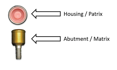Implant overdenture attachment systems are typically made of several components: the abutment, the matrix, and the patrix. The abutment is the component that inserts directly into the dental implant and serves as a functional means of anchoring a prosthesis to the dental implant.10 The abutment typically serves as a matrix that permits attachment to the prosthesis using a retentive element, or patrix. The patrix is often comprised of a polymer, such as nylon or poly(ether) ether ketone (PEEK), which is under function and can withstand functional forces. The patrix insert is often encased by a metal housing that permits simple replacement when these forces result in wear of the polymer component (Figure 1).