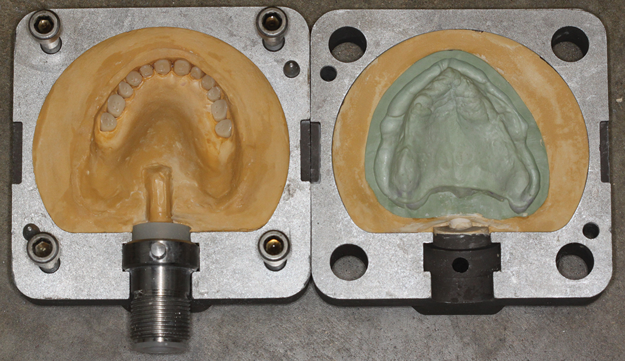 After a clinician has completed the impression procedure and tried in the prosthesis to confirm esthetics and tooth position, the laboratory completes the processing of the prosthesis. Prior to processing techniques, a technician creates a denture tooth assessment (also known as a wax-up), whereby denture teeth are suspended in pink baseplate wax onto mounted dental casts (Figure 2). The clinician has the patient return and places the proposed assessment onto the edentulous ridge to confirm the proper tooth, esthetic, and occlusal relationships, with the patient providing feedback. After confirming the aforementioned, the technician can begin processing procedures, which typically involve incorporating/flasking the denture tooth setup into a mold, followed by heating/boiling the mold until it reaches the melting point of the wax, when it is separated and the wax is washed away (Figure 3). This classic approach is often called a "lost-wax technique," as one is relying upon the low melting point of the wax to permit a simple separation procedure, leaving the denture teeth locked into one portion of the mold and the cast with the tissue surface or bar framework of the prosthesis in the other portion (Figure 4).