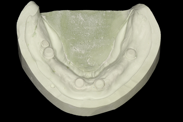 As a result, technicians are often concerned with using resin for processing of housing/patrices with tissue-supported overdentures or bar overdenture frameworks (Figure 6). Processing errors and distortion of between 1% and 25% may not be evident in tissue-supported complete dentures; however, they may be substantially more evident with overdenture attachment systems that are primarily tissue-supported and implant retained. Increasing the number of implants, adding a bar framework, and using non-resilient attachments systems tends to increase the amount of support derived from the implant attachment. Bar overdentures tend to be more implant-supported than stud-style attachment systems. Additionally, fabricating bar overdentures often involves having a stone cast with the bar on the cast, permitting the technician a tremendous amount of control to ensure processing techniques result in a prosthesis that is retentive and stable (Figure 7). As a result, a bar overdenture prosthesis may be an ideal prosthesis option for using laboratory processing of attachments compared to that of a tissue-supported complete denture.