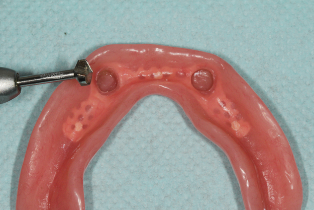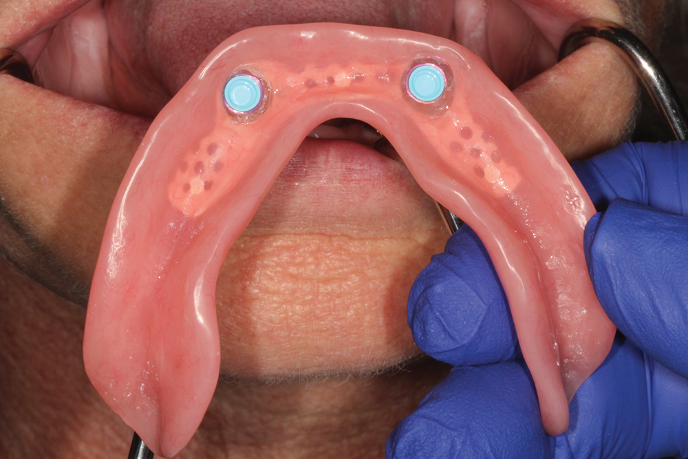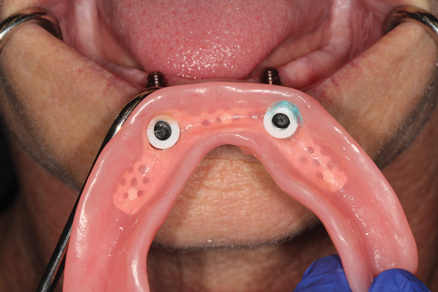Chairside processing of housings/patrices are performed with the patient present and after the prosthesis has been fully adapted to the edentulous ridge without engaging the implants. A clinician can place a block-out spacer to prevent excess resin from flowing underneath the housings during processing of the attachments (Figure 13). The laboratory-prepared recesses are slightly enlarged using acrylic burs specific to stud-style attachment systems and mechanical undercuts are placed within the prosthesis (Figure 14). Additionally, a hole is prepared between the recess and the cameo, or outside, surface of the prosthesis to act as a vent so any excess resin can flow out the prosthesis and not onto the edentulous ridge. Acrylic or composite resin is flowed into the prepared recess and the clinician seats the prosthesis onto the edentulous ridge (Figure 15 and Figure 16). Some clinicians prefer to have the patient close into centric or bite down during this step; however, many believe that this can increase displacement of the soft tissues. As a result, some prefer to hold the prosthesis on the edentulous ridge, evenly applying pressure to ensure excessive biting pressures are prevented. This approach can potentially result is an evenly adapted tissue-supported, implant-retained prosthesis compared to the potential of having a prosthesis not evenly seated onto the edentulous ridge due to the patient not evenly closing into centric. This approach, furthermore, can maximize tissue support and minimize implant support of the final prosthesis. After the resin has completely polymerized, the prosthesis is removed and inspected to ensure housings/patrices are properly attached and minimal resin displaced onto the edentulous ridge (Figure 17). Processing inserts are changed for retentive inserts, the prosthesis is placed onto the edentulous ridge, and implants are engaged to confirm complete adaptation and proper retention and stability of the prosthesis (Figure 18).