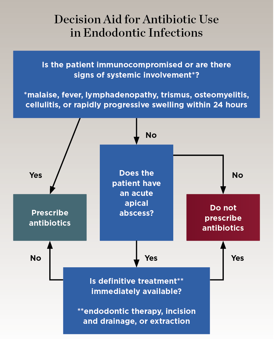 In most cases of endodontic infection, antibiotic use is neither necessary nor appropriate. Chronic apical abscesses with sinus tracts do not warrant antibiotic use. Localized, acute abscesses do not require antibiotics when definitive treatment is available. Antibiotics are not indicated in cases of symptomatic irreversible pulpitis or pulp necrosis with symptomatic or asymptomatic apical periodontitis.9 In any of these cases, antibiotics should be used only if systemic signs of infection are present or when a patient is medically compromised, as guided by the patient's medical providers. Oral analgesics, namely ibuprofen and acetaminophen, represent the gold standard for managing endodontic pain, and their use is usually indicated over antibiotics.12 The majority of endodontic infections are most effectively and safely managed without antibiotics (Figure 1).