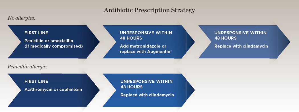 In general, for infections that warrant systemic antibiotic prescriptions, a systematic approach to prescription is essential. Clinicians should start by prescribing the narrowest-spectrum drug possible for the shortest duration in order to specifically target the pathogenic species while minimizing effects on normal flora. The best choices for initial treatment in the non-penicillin-allergic population are penicillin VK and amoxicillin. For infections that do not resolve with these medications within 48 hours, clavulanic acid in combination with amoxicillin (Augmentin®) can be considered as an alternative drug. Alternatively, metronidazole can be added to a beta-lactam regimen if the infection does not resolve. In penicillin-allergic patients, azithromycin or a cephalosporin should be used as first-line agents (Figure 2 through Figure 4). Current clinical guidelines advise that cephalosporins should only be used if the patient does not have a history of anaphylaxis or angioedema with penicillin due to potential cross-allergenicity between these two drugs.26 If an infection is unresponsive to these first- and second-line choices, clindamycin should be considered as the final, broad-spectrum option (Figure 5).10