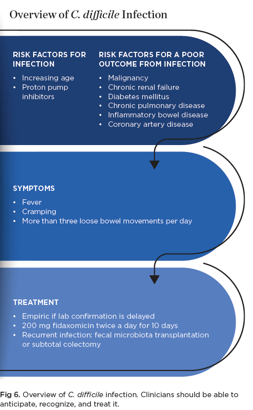 C. difficile is a gram-positive, anaerobic, spore-forming bacillus that produces toxins that cause colitis. C. difficile superinfections develop when oral antibiotics wipe out protective gastrointestinal flora, resulting in overgrowth of C. difficile within the intestines. Recent data from the Centers for Disease Control and Prevention reports that about 500,000 cases of C. difficile in fection are diagnosed in the United States annually, 41% of which are acquired from the community rather than nosocomially. Infection-related mortality for C. difficile infection has been reported between 0.8% and 5%.9,15,16 The most significant risk factor for C. difficile infection is antibiotic use. Studies on C. difficile in recent years have focused on elucidating which antibiotics are most likely to cause this life-threatening infection.