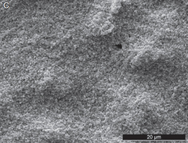 Thus, the smooth surfaces of early ceramic implants resulted in lower osseointegration and, consequently, higher implant loss rates. Therefore, the goal became the design of rough surfaces to achieve higher BIC, as with titanium implants, and thus improve osseointegration. Ideal surface roughness is 1.0 μm to 2.0 μm,49 and this has already been achieved with ceramic implants.50 However, while the machining of a titanium surface is comparatively simple, when industrial machining a zirconium dioxide surface, potential structural changes in the crystal structure (phase transformation) due to excessive energy input must be avoided. Various surface processing methods, therefore, are used to increase the macro- and microstructure. These methods include, among others, the creation of a rough surface directly over the mold in the CIM process, surface modification by laser, the application of additional coatings, and creation of the macrostructure by sandblasting followed by microstructuring via thermal surface etching with different acids and resulting in different etching patterns (Figure 6). Ultimately, ceramic implants with modern microroughened surfaces have demonstrated in animal studies and various reviews osseointegration rates comparable to titanium implants,51-53 and, thus, similar long-term results can be expected.