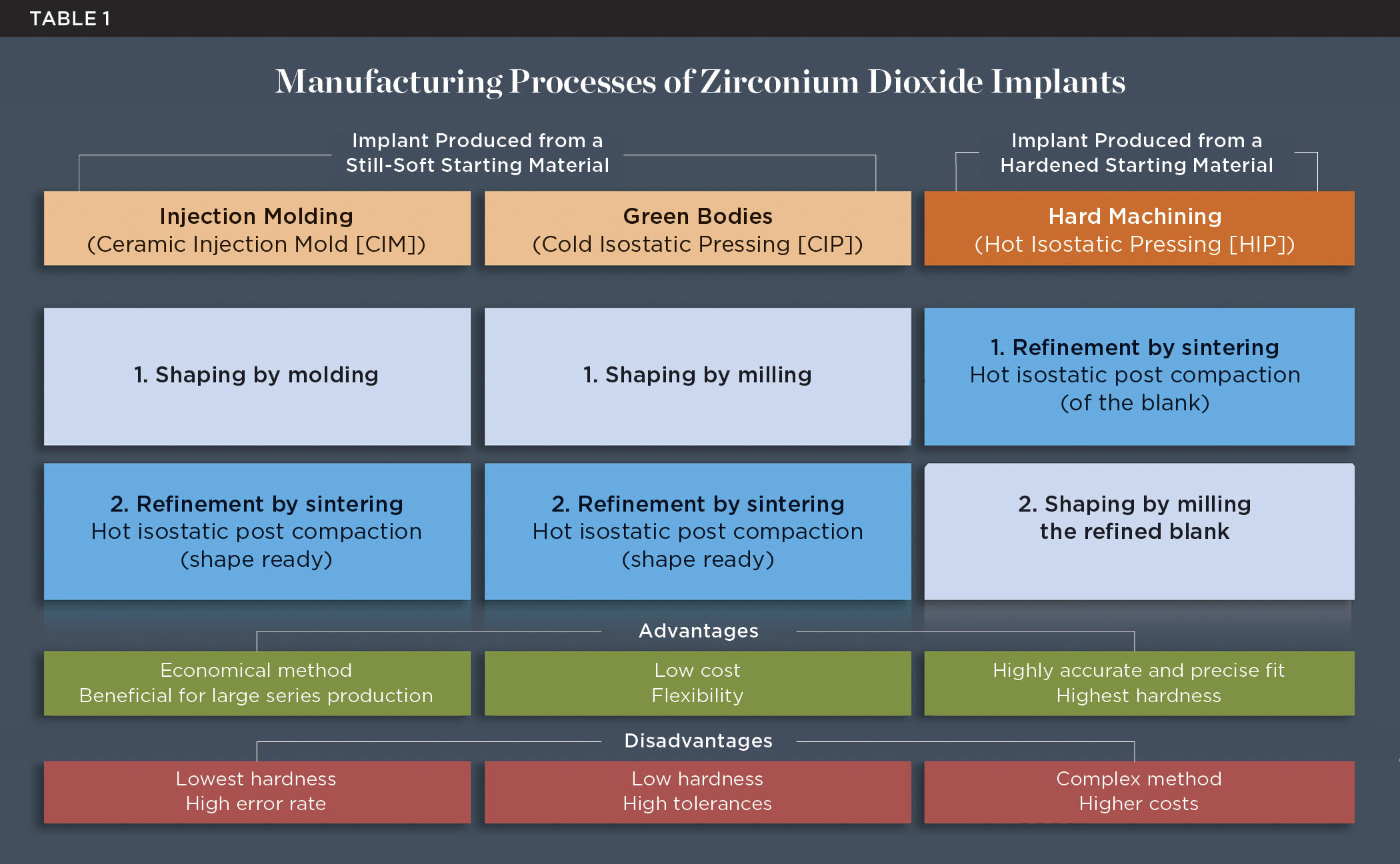 The industrial manufacturing process also has an influence on the long-term success of ceramic implants. Grain size, purity, density, as well as size, quantity, and distribution of possible defects in the material have a significant effect on the hardness and quality of the implant. Two basic processes for manufacturing ceramic implants can be distinguished: production of the implant from a still-soft starting material and from an already-hardened starting material. The first process can be done using one of two methods, either ceramic injection molding (CIM), where shaping is first performed by injection molding,46 or cold isostatic pressing (CIP), which entails milling the still-soft starting material (green compact machining). In both of these methods, the blank is then hardened and refined through sintering, or firing. Both methods are cost-effective, but up to 20% sinter shrinkage must be factored in.47 This shrinkage can lead to higher susceptibility to defects and defect inclusions. In the second manufacturing process, called hard machining, the procedure is reversed: first a block of material is refined (sintered) and only then, at great industrial expense, is the mold ground from the finished, hard blank. This process is more expensive and time-consuming but is capable of yielding very high-quality and precise results (Table 1).
