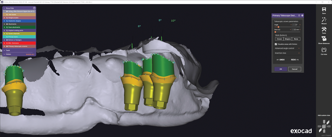 A typical digital workflow for the design of primary telescopes starts with working from either a scanned implant master model or an intraoral scan combined with a photogrammetric scan of the implant positions.9 Most dental design softwares have a specialized "telescopic module," which keeps all of the abutments parallel to each other and set at the user-defined insertion/removal path (Figure 4). Options are also available to the designer in terms of surface angle; for example, the telescopes can be made to be 0 degrees or in any conical configuration from 1 degree and up. It should be noted that only abutments with 0-degree abutment walls are technically called "telescopes," whereas anything more than 0 degrees is considered to be conical in design.