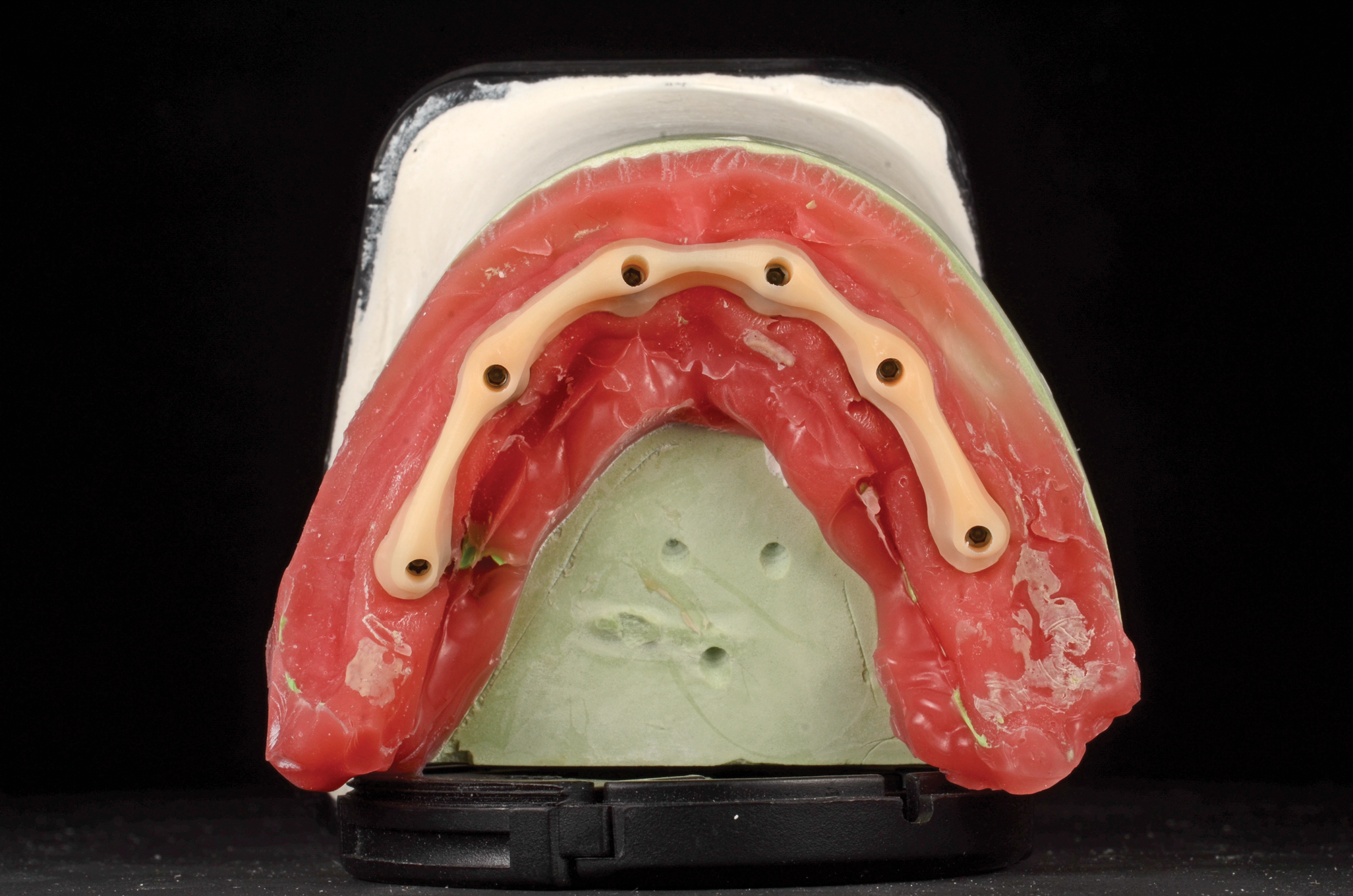 Digital technologies have also boosted efficiency when creating a primary telescopic or conical bar for use with a sleeve-type secondary component. The primary bar can simply be designed and manufactured followed by hand-milling, or for a truly customizable and combined analog approach the model can be scanned and an overbulked bar can be designed in the software. The overbulked bar design can be easily printed in a variety of 3D resins direct to the implant or multi-unit platform. The printed bar can be screwed onto the master cast and then hand-milled to final dimensions using analog matrices of approved tooth positions (Figure 5). The marginal apron can be customized by hand, and, once finalized, the primary bar can be scanned and created as a copy mill along with the scan of the model with scan markers and sent to the milling center for reproduction (Figure 6).