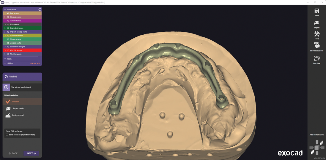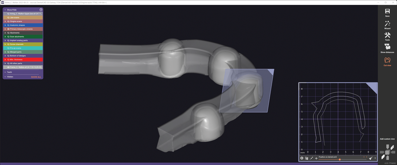 Digital design also enables the inclusion of spacers from a STL file for specialized attachments that are designed to work in concert with telescopic abutments and bars. These STL file attachments can be easily snapped onto the surface of the primary abutment or bar digitally, and the tertiary frame can be designed over the primary structure with snapped attachment spacers so that, once milled, the attachments can simply be inserted into the tertiary frame.