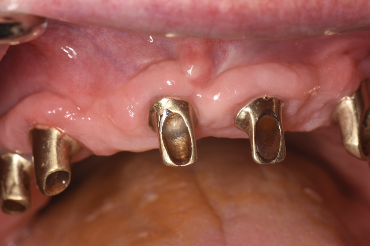 Most telescopic and conical cases comprise three major components: a primary abutment or bar; a secondary component, typically a coping; and a tertiary structure. As mentioned earlier, primary telescopes and conical abutments traditionally were made using a UCLA abutment, to which wax was added by hand, and the abutment was then milled in wax. Abutments were then invested and cast in a type IV gold alloy or CoCr. This was a laborious process, and material and technique complications often led to flawed results, such as porosities and gaps in the primary components (Figure 2).6