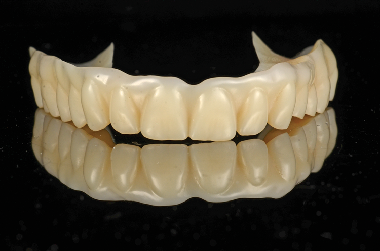 More recently, 3D printing has had a major influence on many facets of dental technology, including the fabrication of temporary restorations. Initially, 3D resins used for this purpose were found to be somewhat brittle, but now there are numerous nano-ceramic-filled 3D resins that are showing considerable promise.3 Nano-ceramic hybrid 3D resins have improved optical properties and strength versus earlier 3D resins. Additionally, anecdotally, newer protocols, 3D printer settings, and third-party build plates combined with special settings can allow for in-office printing of full-arch temporaries in approximately 30 minutes (Figure 11). Figure 12 and Figure 13 depict a finished telescopic case.