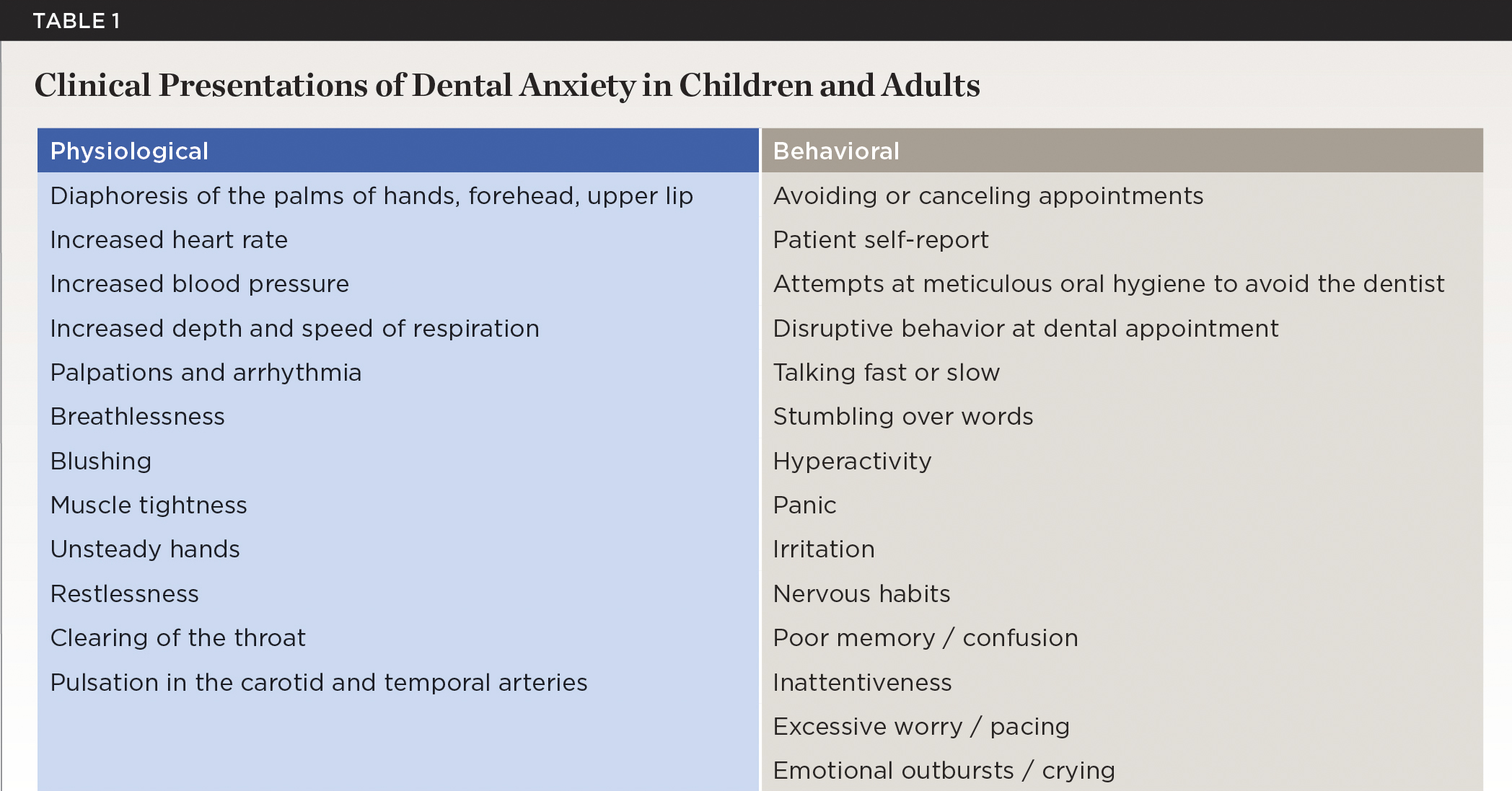The clinical presentations of dental anxiety vary greatly among patients and can present as physiological and behavioral signsand are summarized in Table 1.2,4,9 These presentations may vary depending on the race, gender, age, and degree of anxiety of the patient.