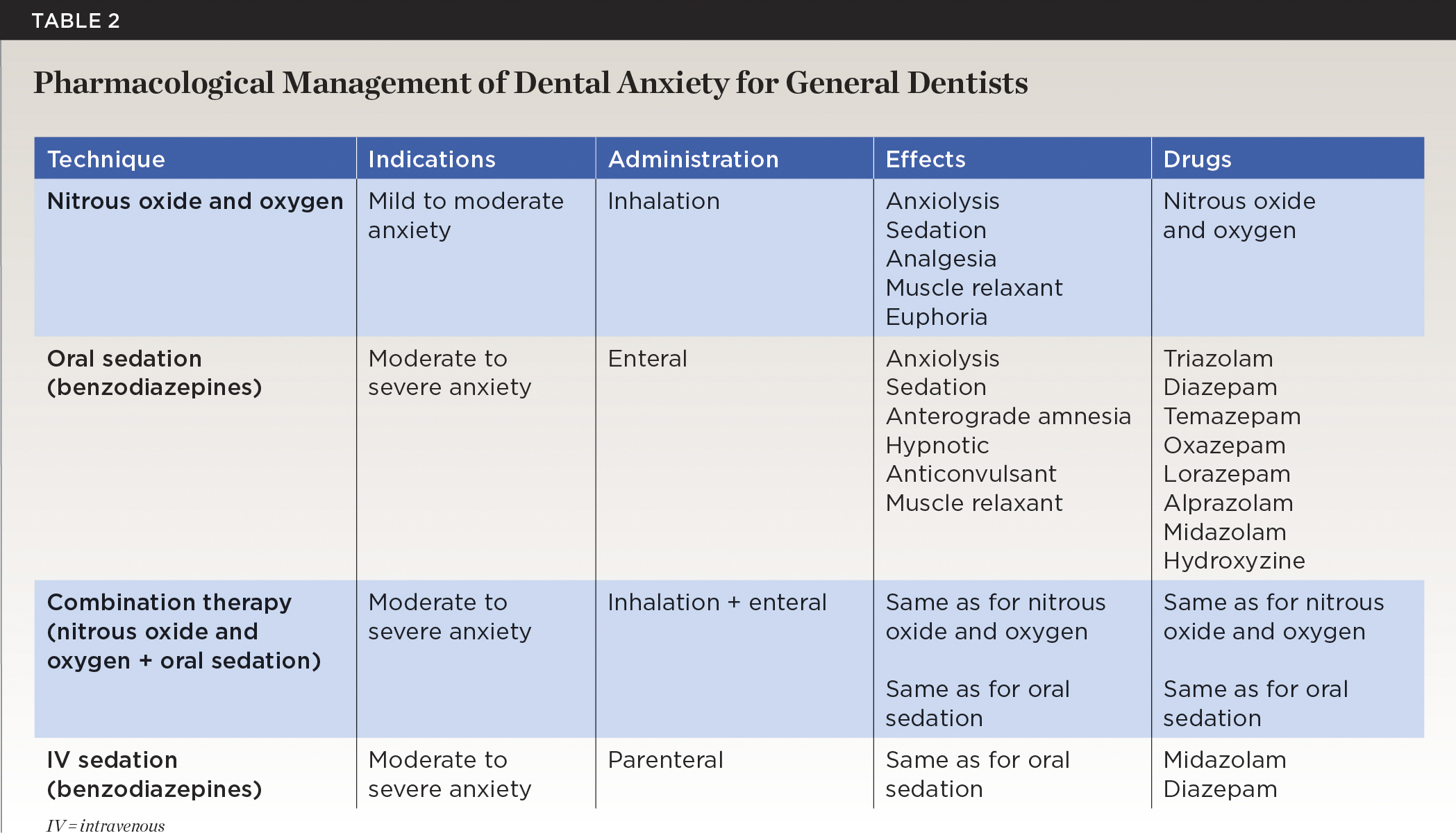 Oral sedation in general dentistry most typically consists of the oral administration of benzodiazepines prior to dental treatment for anxiolysis and other effects described in Table 2. This approach is indicated for moderate to severe dental anxiety with an overall goal of conscious sedation.