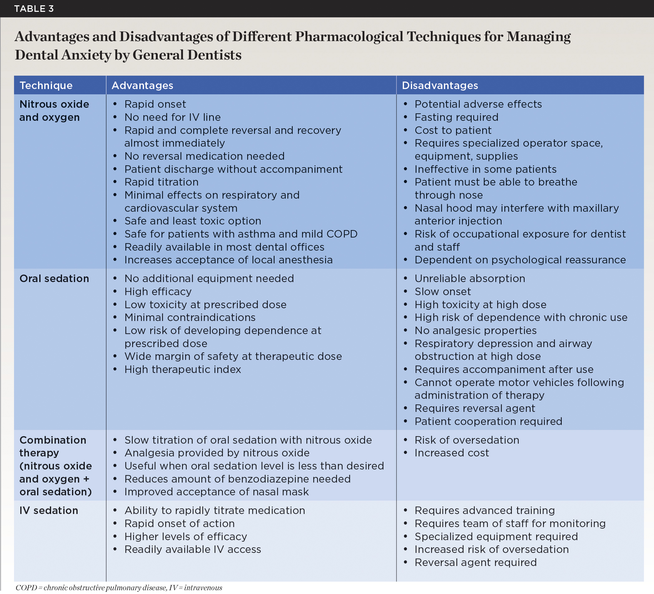 Advantages and disadvantages of IV sedation are described in Table 3. A major advantage of IV sedation is the ability to titrate the medications depending on patient response.24 Also, a more rapid onset of action and higher levels of efficacy are achieved when compared to oral and inhalation sedation.2 Another advantage is that there is readily available IV access for the administration of emergency drugs or reversal agents if needed.2 Disadvantages of IV sedation include the need for additional equipment, staff to monitor and assist with sedation, and increased risk of deeper levels of sedation due to the rapid onset of action.24