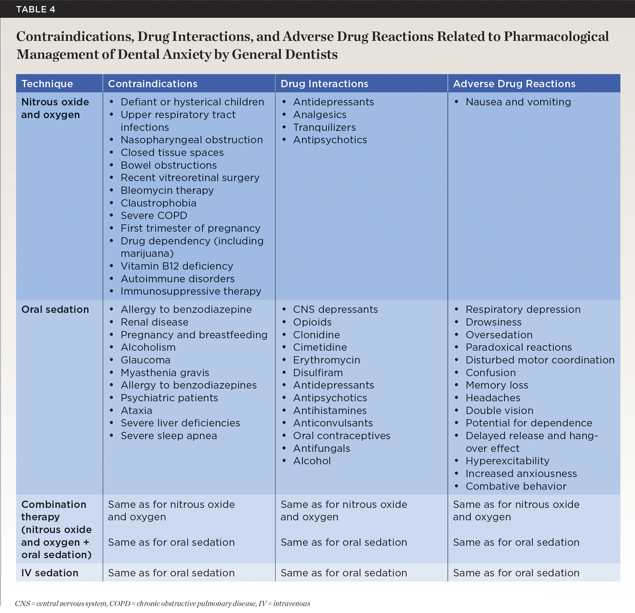 The contraindications and disadvantages of nitrous oxide and oxygen are described in Table 3 and Table 4. The main adverse effect is nausea and vomiting, which occurs in 0.5% to 1.2% of patients and can be minimized through fasting prior to sedation.19 Nitrous oxide is ineffective in young patients that are defiant or hysterical, and is contraindicated in patients with upper respiratory tract infections, nasopharyngeal obstruction, closed tissue spaces, bowel obstructions, recent vitreoretinal surgery, bleomycin therapy, claustrophobia, and severe chronic obstructive pulmonary disease, or for those in the first trimester of pregnancy or at risk of drug dependency.19,21,22 Nitrous oxide should also be monitored closely in patients taking drugs that depress the CNS, including antidepressants, analgesics, tranquilizers, and antipsychotics, as the effects may be compounded and can lead to increased sedation.19 Long-term use can induce neurological and hematological symptoms as a result of the depletion of cobalamin (vitamin B12) and should therefore be used with caution if cobalamin deficiency is suspected.10,19 Another disadvantage of using nitrous oxide and oxygen is that specialized equipment is required, including a breathing circuit, flowmeter assembly, regulators, pressure gauges, and cylinders.2,21