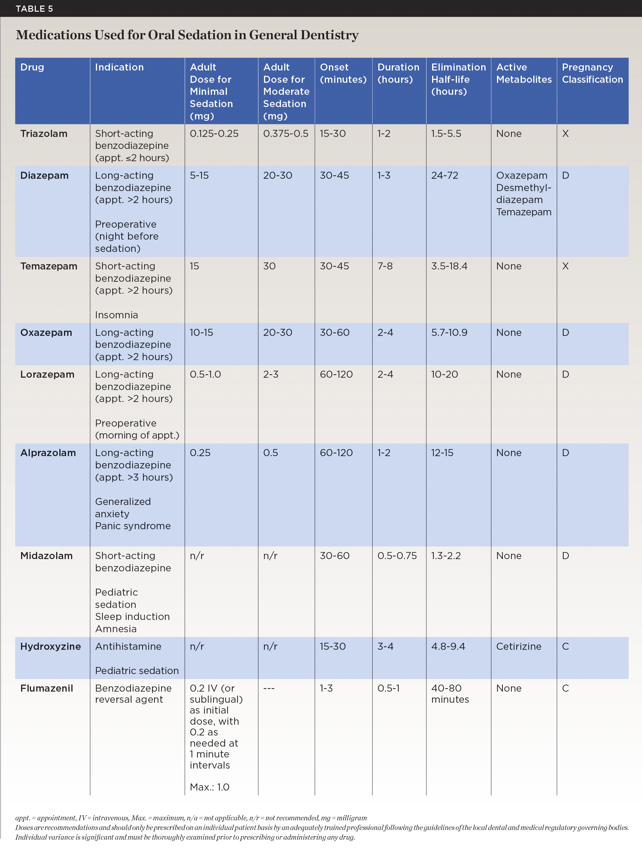 The most common benzodiazepines used for the sedation of adults in dentistry include triazolam, diazepam, midazolam, and lorazepam, with others such as temazepam, oxazepam, and alprazolam available for use. All of which vary in onset, metabolism, duration, and degree of sedation.18 The effects of these drugs vary in terms of sedation, hypnotic effects, skeletal muscle relaxation, anticonvulsant effects, saliva reduction, vomit reflex, coronary dilation, and neuromuscular blocking.9 These drugs, including their associated indications, adult doses, onset, duration, half-lives, active metabolites, and pregnancy classifications are outlined in Table 5.9,10,14,18,24