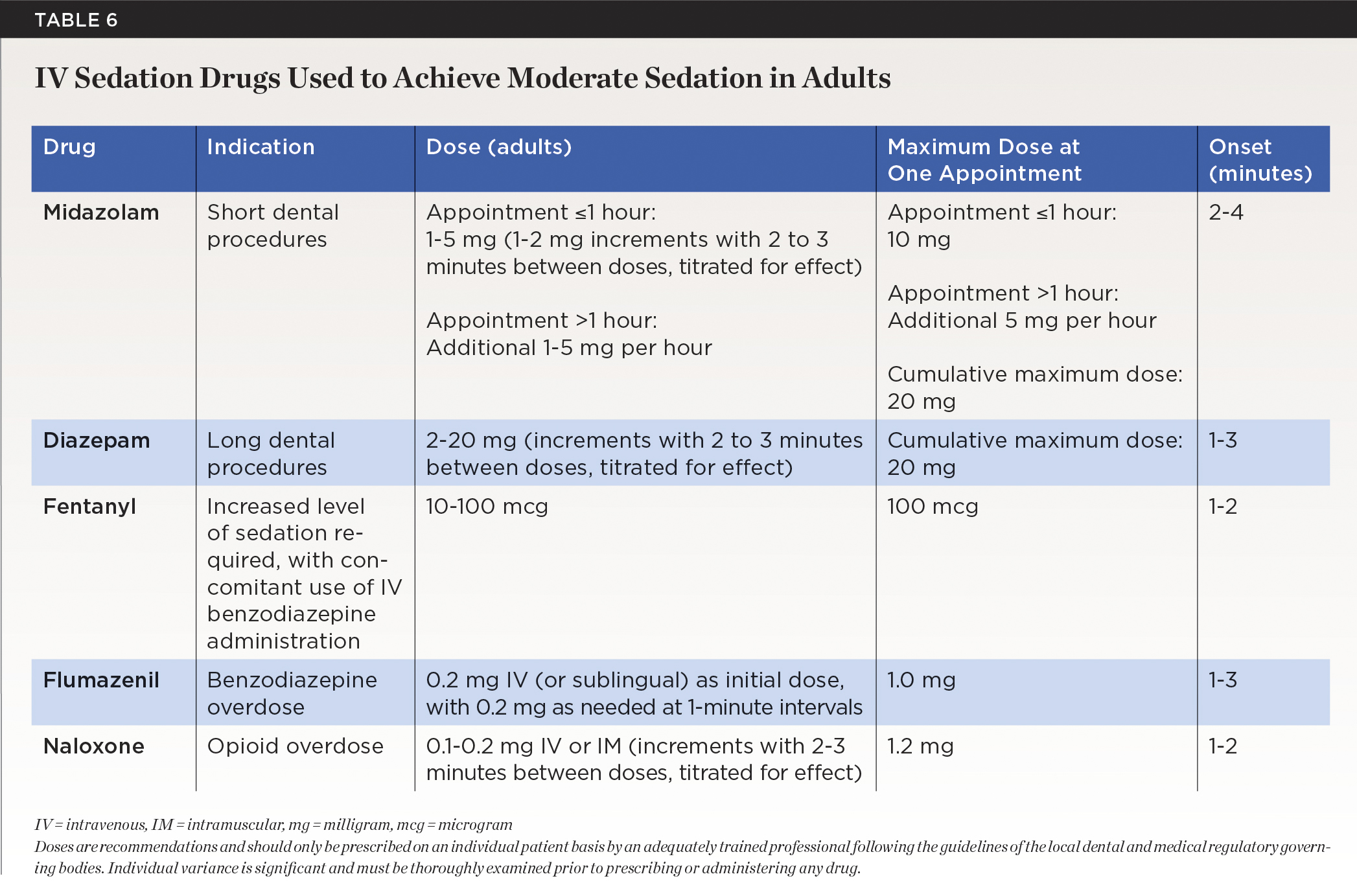 The drugs used for IV sedation most commonly are benzodiazepines such as midazolam and diazepam, and certain opioids such as fentanyl. The IV drugs that can be administered by a trained general dentist depend on the guidelines as set by the local medical and dental regulatory governing bodies. Both midazolam and diazepam are lipid-soluble drugs formulated in solutions prepared for intravenous administration.24 Midazolam is highly lipophilic and, therefore, has a fast onset in the CNS and a large volume of distribution.24 Due to its metabolism and clearance, midazolam is considered a short-acting drug when compared to diazepam.24 The reversal agent, flumazenil, is administered IV when needed in cases of oversedation. The medications and doses used for IV sedation in adults are summarized in Table 6.14,24