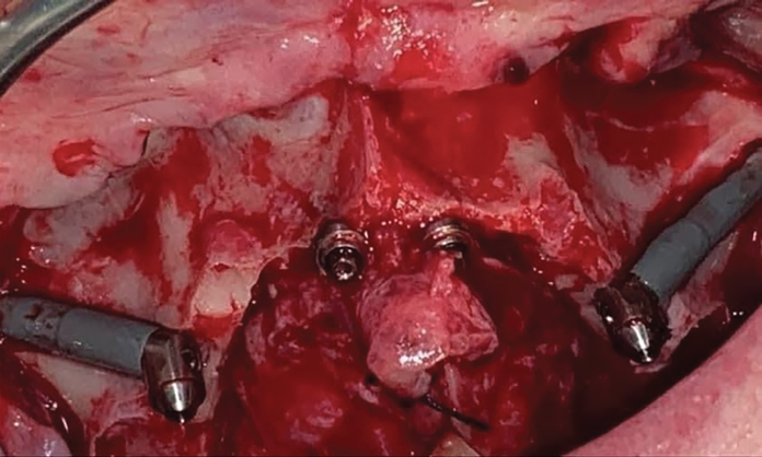 During the day of delivery, after sufficient exposure of the underlying anatomical buttresses is achieved, the implant is checked for proper adaptation, and any necessary modifications are made before final insertion. The implant is stabilized in place with monocortical screws inserted through predetermined holes in the underlying bone. The flap is properly dissected to gain sufficient passivity to achieve primary intention closure around the exposed implant abutments.8 After the necessary healing period, the proper impressions are taken for final prosthesis manufacturing and delivery.
