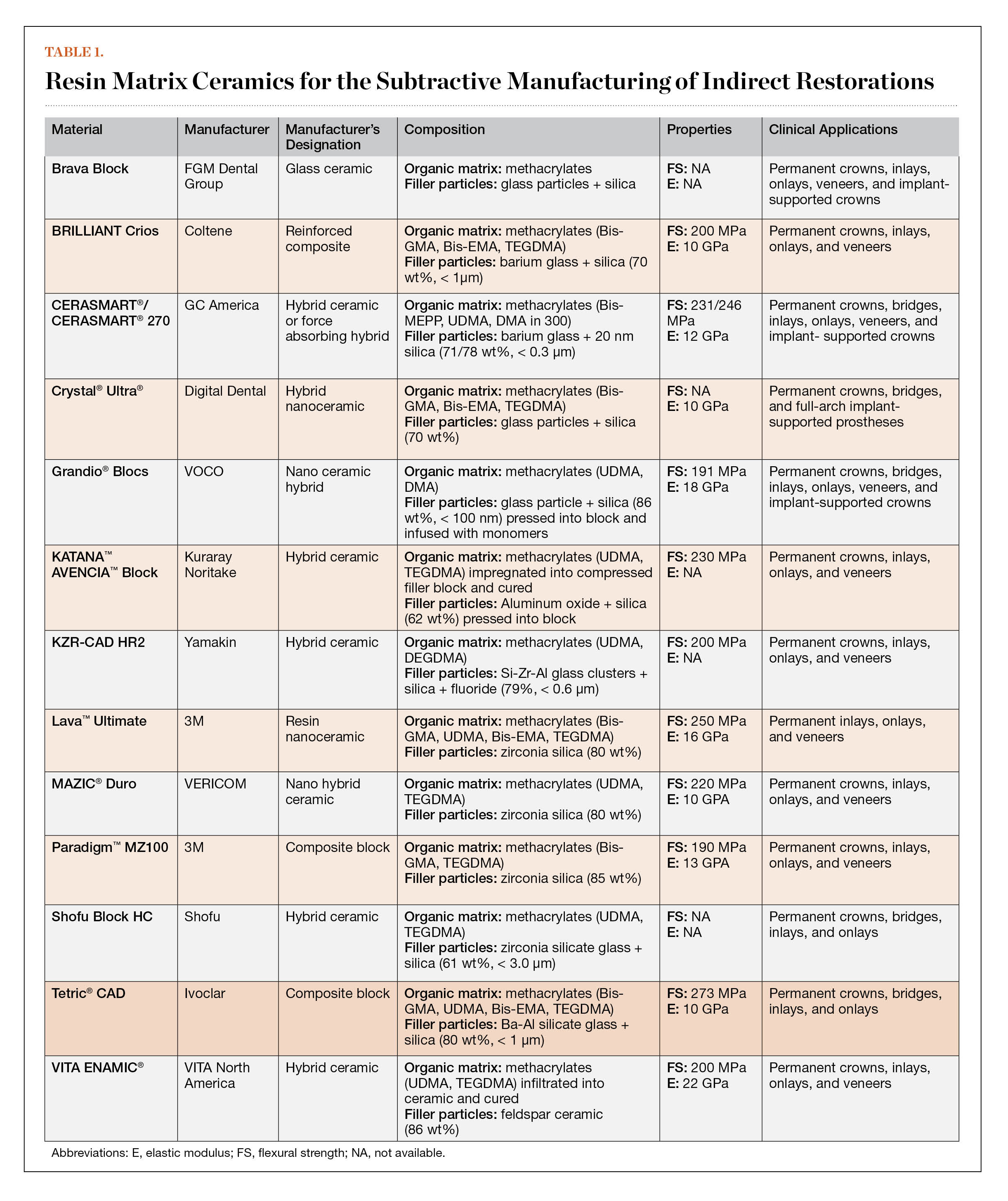 Subtractive manufacturing (ie, milling) has undergone tremendous refinement and adaptation to become a primary means of producing indirect dental restorations. Although blocks made entirely of ceramics are the most popular, there are many resin-based materials available. These resin matrix ceramics (RMCs) are subdivided into two categories: dispersed filler resin-based ceramics, which are basically composites, and polymer-infiltrated ceramic network (PICN) materials.1 It has been suggested that when compared with all-ceramic CAD/CAM blocks, RMC CAD/CAM blocks have higher load capacity and a modulus of elasticity that is closer to that of natural tooth structure, which is possibly better for implant restorations; are easier to mill; and are better at facilitating intraoral repairs.2,3 In addition, staining and finishing is relatively easy because these resin-based systems do not require any post-milling heat treatment processes. However, RMCs tend to be weaker and less wear resistant than all-ceramics.4