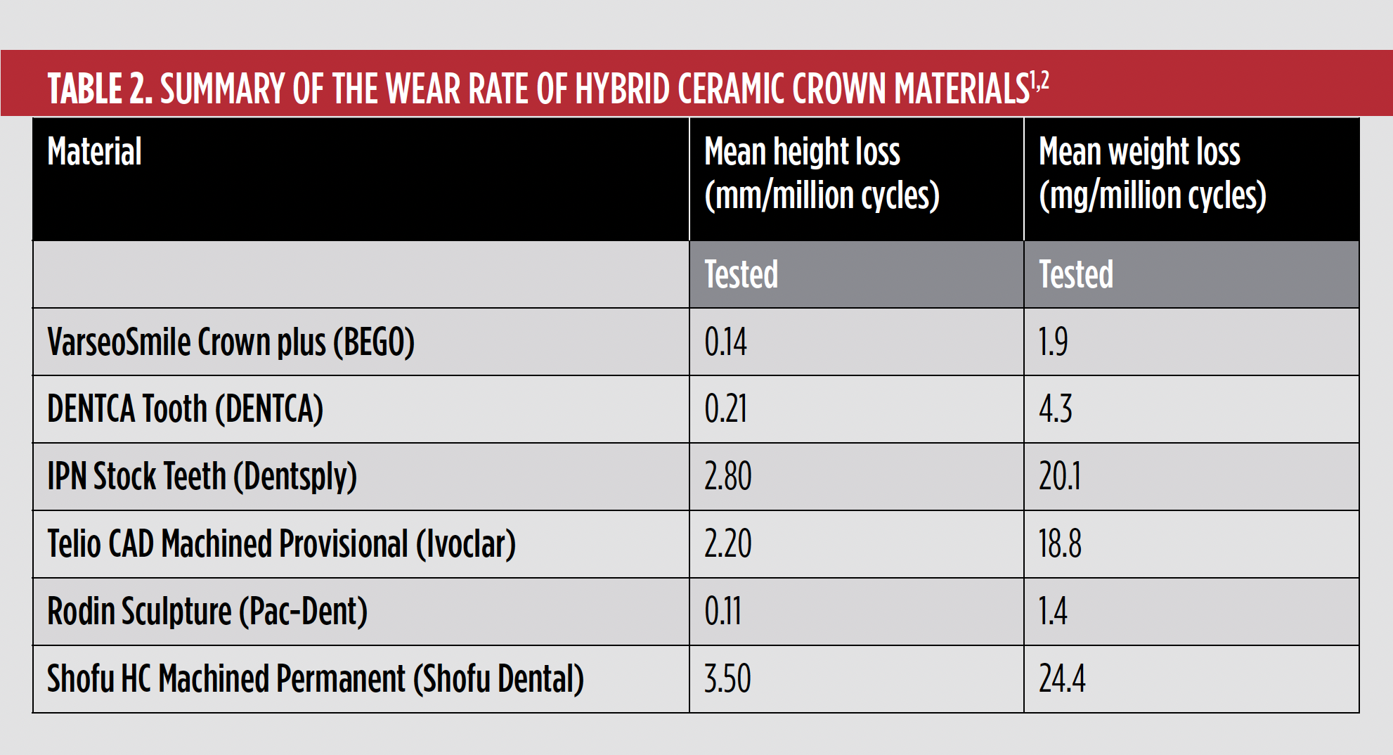 There is limited data available for many of the new materials for 3D printing. The mechanical properties of a variety of these materials, which were obtained from manufacturer self-reported data and independent research, are summarized in Table 1.22-25 In looking at the literature, the filler content values of many of these materials are reported by the manufacturers as a range of 30% to 50%. Assuming that this is weight%, many of these materials may not actually meet the ADA criteria. Other properties that need to be taken into consideration in the evaluation of new 3D printed crown materials include surface finish and rate of wear. The surface finish of a restoration may affect bacterial adhesion and color stability. More specifically, a rough composite resin surface may lead to plaque accumulation and recurrent decay.26 Staining is also increased if a highly polished and smooth surface cannot be achieved. Color stability is partially related to the surface finish of hybrid ceramic materials, but it can also be greatly influenced by the chemical bond between the filler and the surrounding polymer. If the bond is not stable, over time, cracks can open between polymer matrix and the filler, allowing the percolation of fluids into the material that may result in discoloration and excessive wear as well as fracture of the restoration.27 There is very limited data on wear rate of hybrid ceramic materials. One study that performed 400,000 wear cycles using a University of Alabama at Birmingham type in vitro wear tester determined that the volumetric wear of hybrid ceramic materials ranged from 0.012 mm3 to 0.019 mm3, depending on their composition.24 Wear rates of these materials, which were obtained in the laboratory of the author of this article using the same type of device, are presented in Table 2.