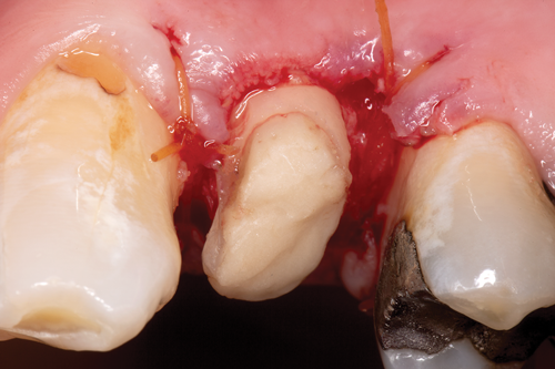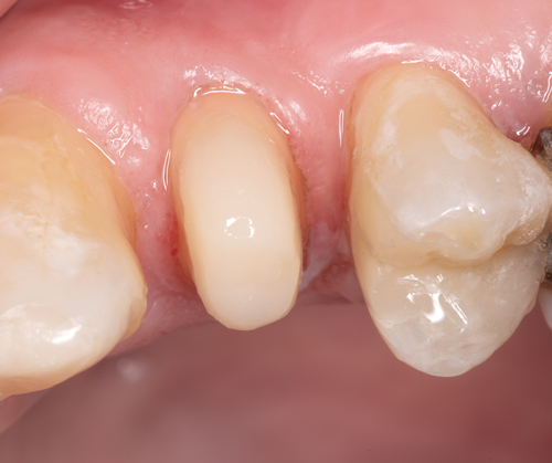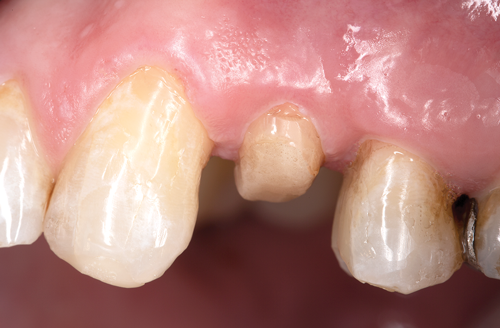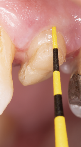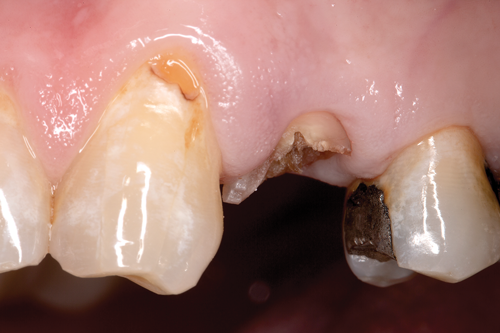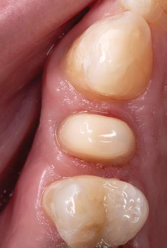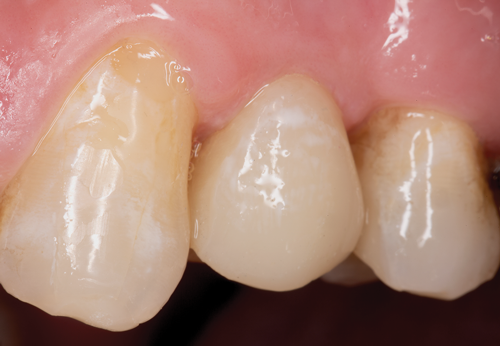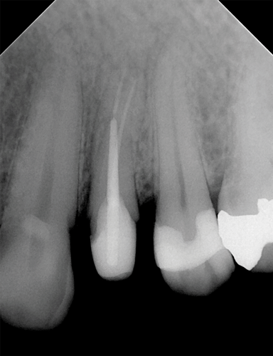 Restorative failure of an existing amalgam restoration on the maxillary left first premolar from recurrent caries is documented here (Figure 2). The periapical radiograph revealed an extensive carious lesion extending into the pulp chamber. After clinical and radiographic evaluation, a treatment plan was discussed with the patient that included endodontic therapy, crown lengthening, and reinforcing the root and supporting the tooth-restorative complex with a fiber-reinforced post and core system.