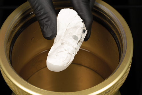 After completion of the endodontic treatment and crown lengthening to develop an ideal ferrule effect (Figure 3 through Figure 5) a diagnostic wax-up was fabricated to an ideal coronal preparation geometric shape, dimension, and height for the anticipated final composite core buildup (Figure 6). A clear polyvinyl siloxane (PVS) impression material was injected into a nonperforated tray, placed over the diagnostic wax-up, and then put into a pressure pot with cold water for 5 minutes. This procedure is aimed at reducing the potential for the formation of voids and bubbles in the impression material (Figure 7 and Figure 8). A small opening was made above the tooth to be restored using a tapered diamond bur (6847) (Figure 9). It is important to clean the internal surfaces with a microbrush to prevent silicone debris from integrating into the flowable material. Prior to the restorative procedure, a diagnostic wax-up was fabricated to the anticipated extracoronal contours for development of the final crown (Figure 10).