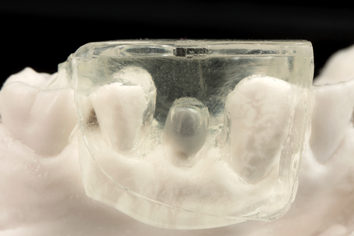 The clear silicone matrix was placed over the posterior segment of the maxillary arch, and an opacious A2-shaded injectable flowable universal resin composite was injected through a small opening above the preparation and fiber post (Figure 20 and Figure 21). The resin composite was cured through the clear resin matrix on the incisal, facial, and lingual aspects for 40 seconds each. Upon removal of the matrix, the excess polymerized composite resin was removed with a #12 scalpel blade, and the incisal sprue was removed using a tapered diamond finishing bur. A round, tapered diamond bur was used to establish the gingival margin (Figure 22) and a needle-shaped finishing bur was used to complete the finishing of the preparation.