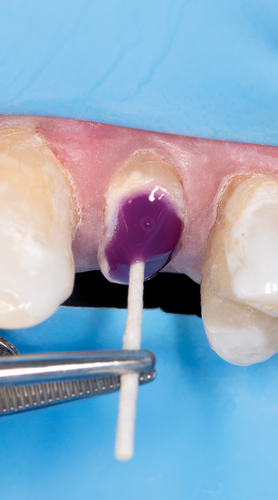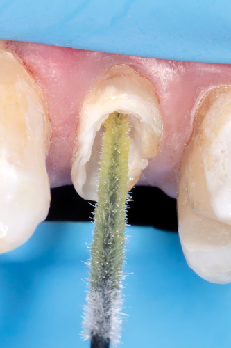 The preselected fiber-reinforced composite post was placed into the channel space, and the coronal height was measured and marked (Figure 12). The post was cleaned with alcohol, and its surface was silanated with a ceramic primer and air-dried after 60 seconds. The prepared channel was cleaned with a 2% chlorhexidine solution, rinsed, and dried with an endodontic paper point. The prepared endodontic channel was then etched for 15 seconds with 37.5% phosphoric acid semigel. The gel was agitated in the post channel with a paper point (Figure 13), rinsed for 5 seconds, and dried with an endodontic paper point without dehydrating the dentin structure. A universal adhesive was applied with an applicator brush onto the walls and base of the channel and air-dried (Figure 14); any excess adhesive was absorbed with an endodontic paper point using a rapid intermittent movement. The adhesive was lightly air-thinned using a warm air tooth dryer and light-cured for 40 seconds. An injectable flowable universal resin composite was injected into the post channel using an angled tip (Figure 15). It is important to remove the tip slowly while injecting to prevent the incorporation of air bubbles. The aforementioned fiber post was immediately inserted into the post space to the base of the prepared channel, and light-curing was performed from different positions (ie, coronal, facial, and lingual) for 2 minutes (Figure 16).