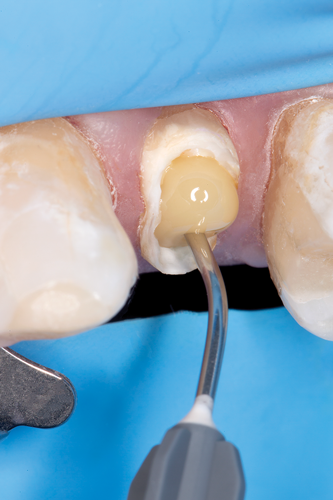 After polymerization and removal of the stopper, the fiber post was cut with a diamond bur to the predetermined length (Figure 17). It should be noted that the clinician should never use a serrated instrument or shears to cut the post to avoid damaging the integrity of the post. The remaining sound tooth structure (ferrule) was etched for 15 seconds with a 37.5% phosphoric acid semigel, rinsed for 5 seconds, and air-dried (Figure 18). With the use of a sable brush, silane was then applied to the coronal portion of the fiber post and existing composite material and air-dried. A universal adhesive was applied to the tooth structure, existing composite material, and fiber post and allowed to dwell for 10 seconds, then air-dried and light-cured (Figure 19).
