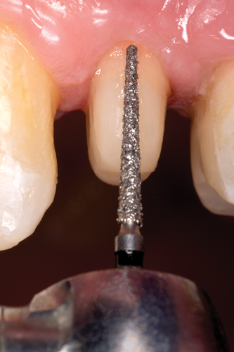 After determination of the desired post channel length (one-half to two-thirds the length of the canal), a dental dam was placed using the modified dam technique. The gutta-percha was removed with a series of preshaping instruments (Gates Glidden drills). The channel preparation for a prefabricated fiber-reinforced post (ie, the fiber-optic post system referred to earlier) was performed using a color-coded drill from this post system, establishing the desired intraradicular length and size for the selected post (Figure 11). The prepared channel was rinsed with water and dried with an endodontic paper point.